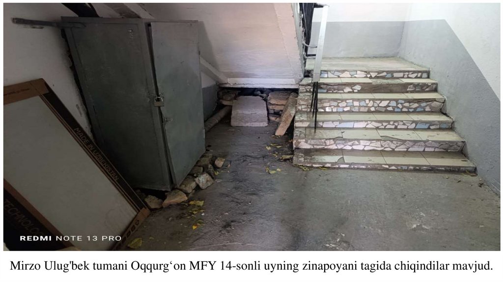 Mirzo Ulug'bek tumani Oqqurg‘on MFY 14-sonli uyning zinapoyani tagida chiqindilar mavjud.