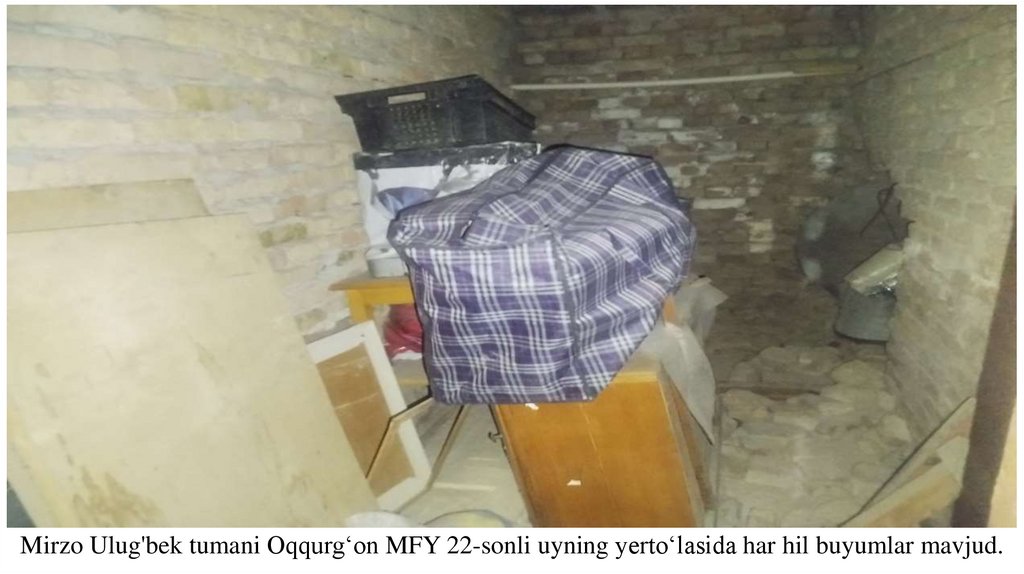 Mirzo Ulug'bek tumani Oqqurg‘on MFY 22-sonli uyning yerto‘lasida har hil buyumlar mavjud.