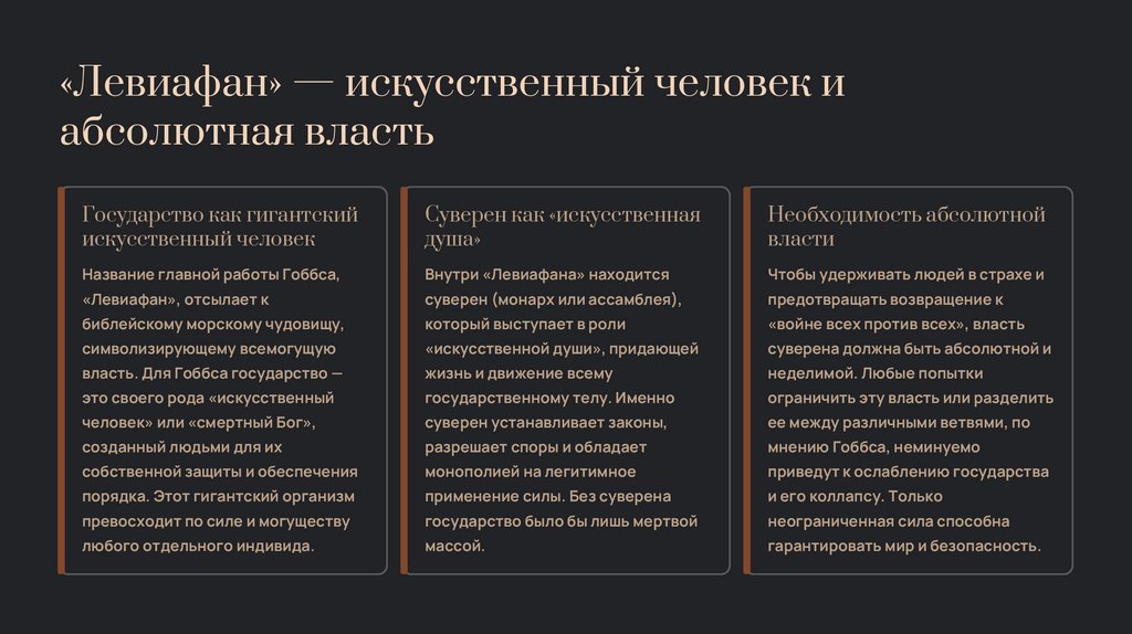 анализ человеческой природы и роли государства в предотвращении хаоса. Его идеи, несмотря на их порой спорный характер,