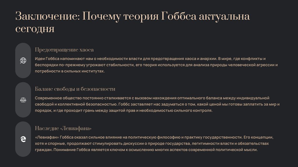 Идеи Гоббса напоминают нам о необходимости власти для предотвращения хаоса и анархии. В мире, где конфликты и