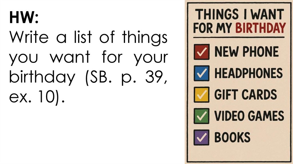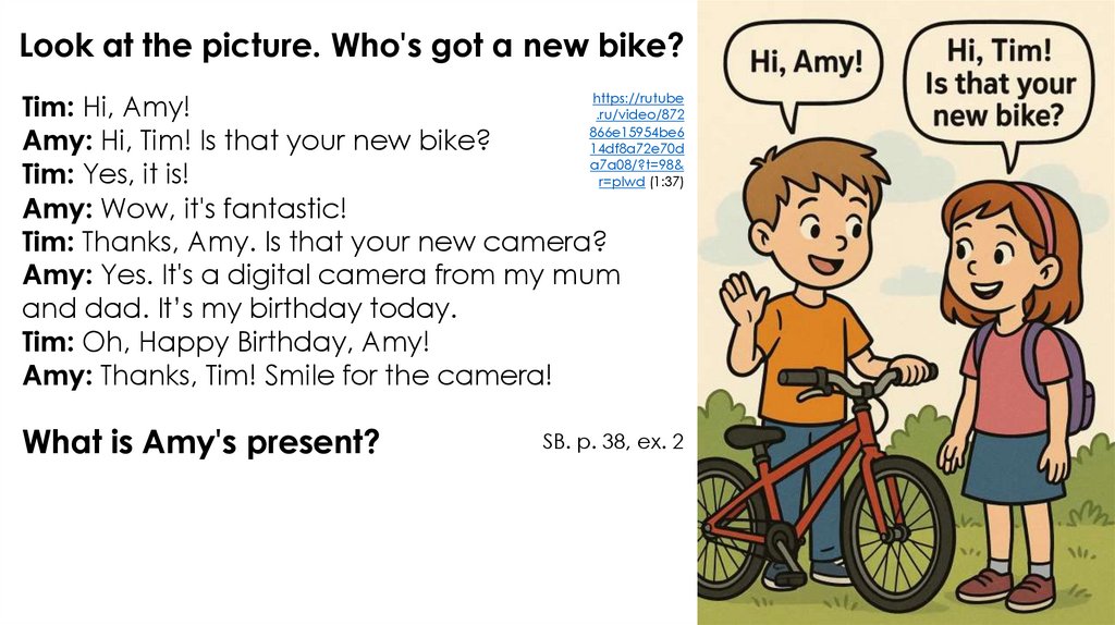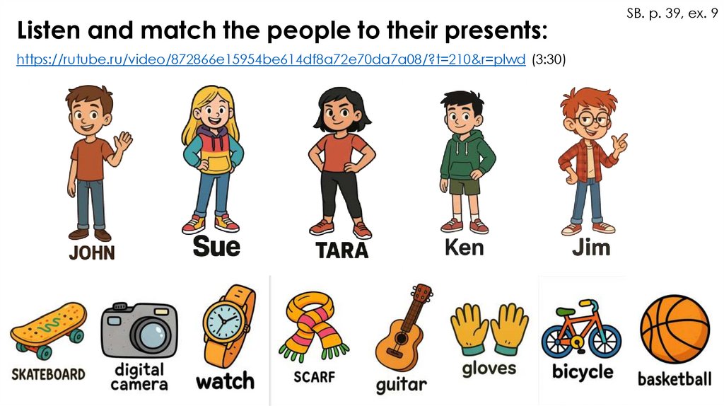 Listen and match the people to their presents:https://rutube.ru/video/872866e15954be614df8a72e70da7a08/?t=210&r=plwd (3:30)