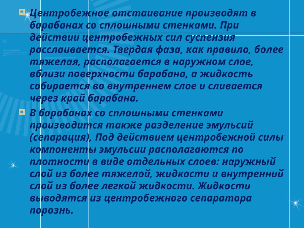 Центробежное отстаивание производят вбарабанах со сплошными стенками. При