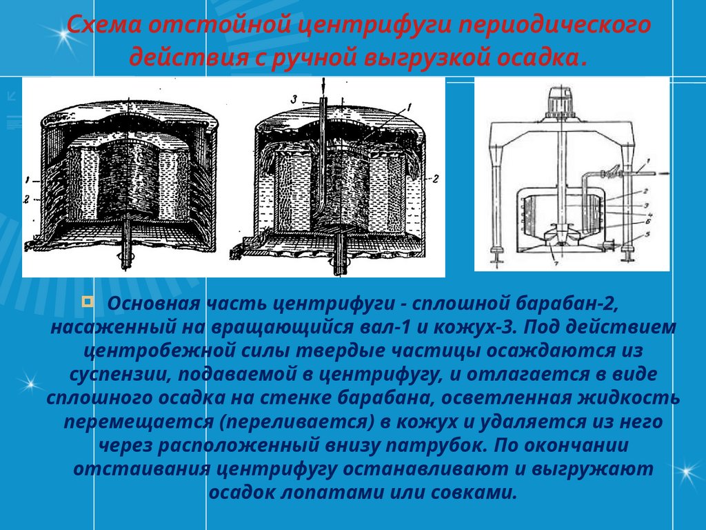 Схема отстойной центрифуги периодическогодействия с ручной выгрузкой осадка.