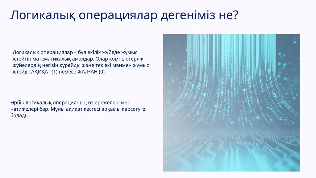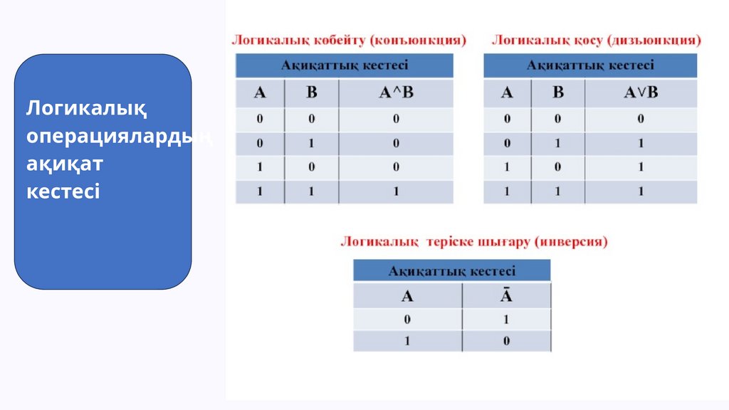 Логикалық операциялар дегеніміз не?Логикалық операциялар – бұл екілік жүйеде жұмыс