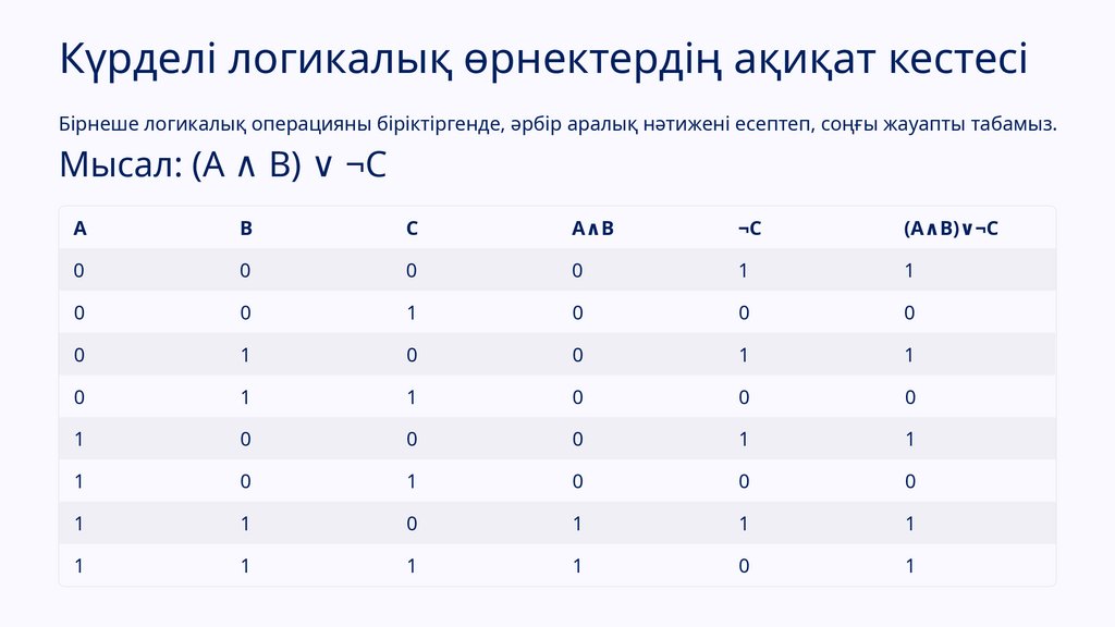 Күрделі логикалық өрнектердің ақиқат кестесіБірнеше логикалық операцияны біріктіргенде, әрбір аралық нәтижені есептеп, соңғы жауапты табамыз.
