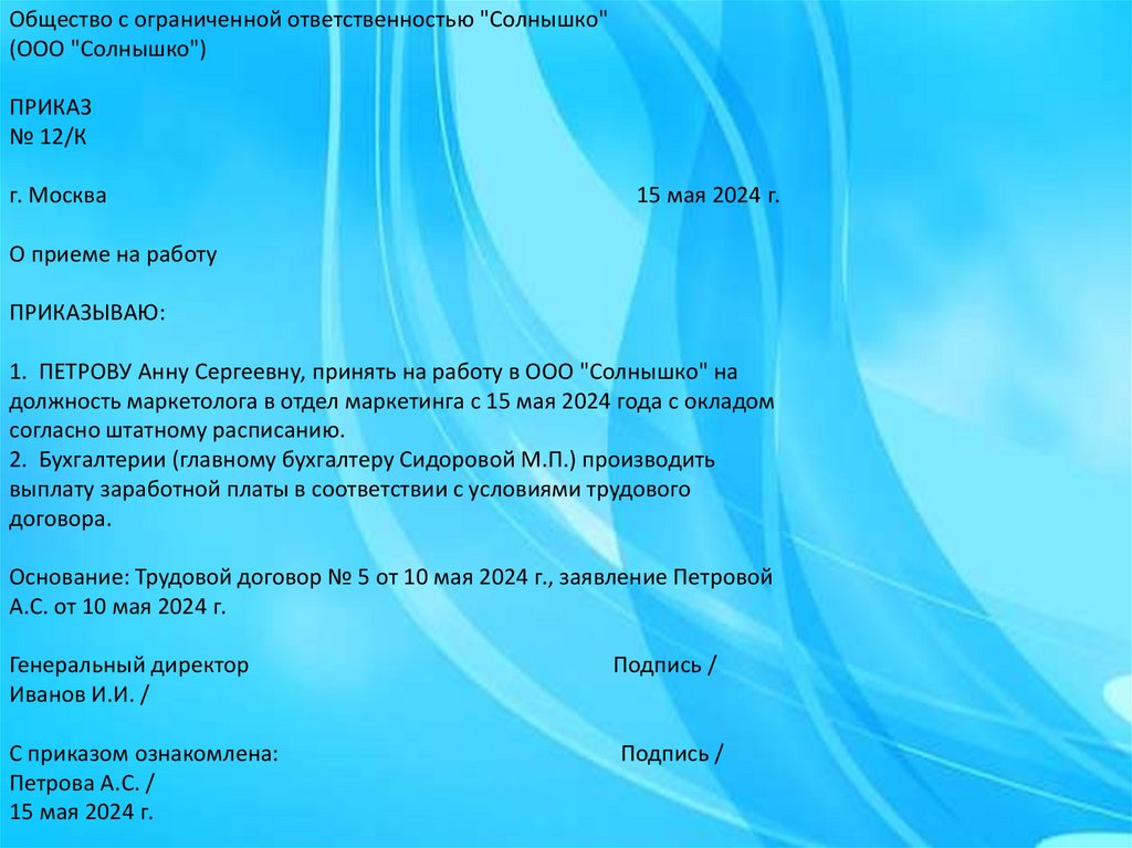 1. ПЕТРОВУ Анну Сергеевну, принять на работу в ООО "Солнышко" на