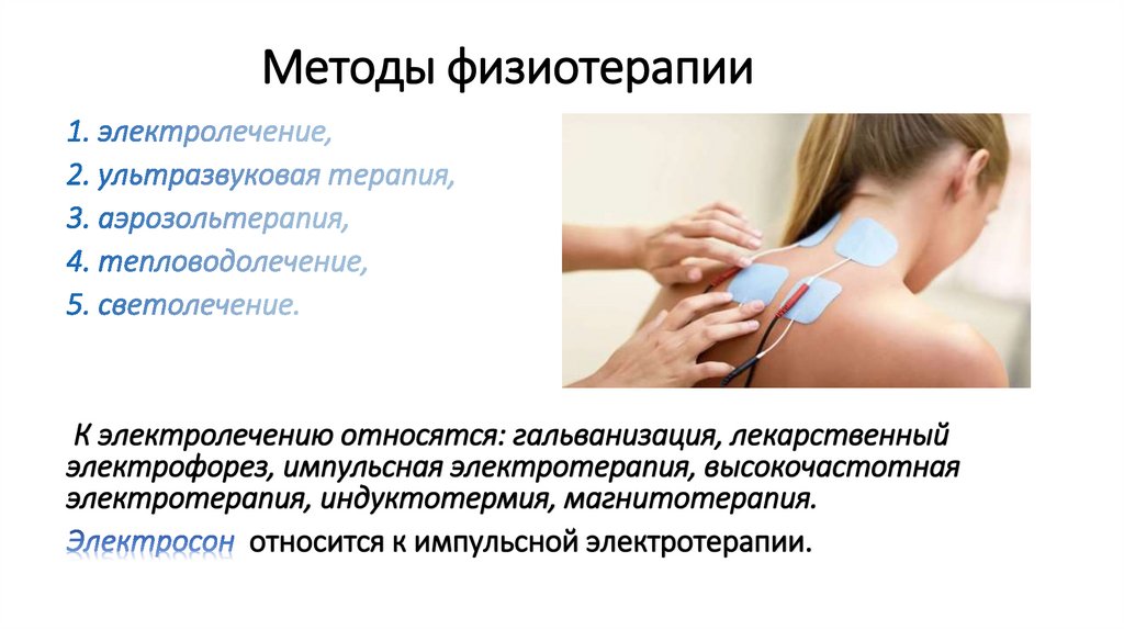 Методы физиотерапииК электролечению относятся: гальванизация, лекарственный