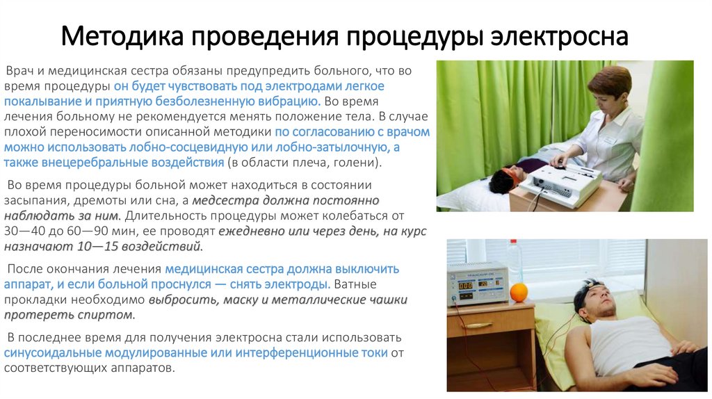 Методика проведения процедуры электроснаВрач и медицинская сестра обязаны предупредить больного, что во