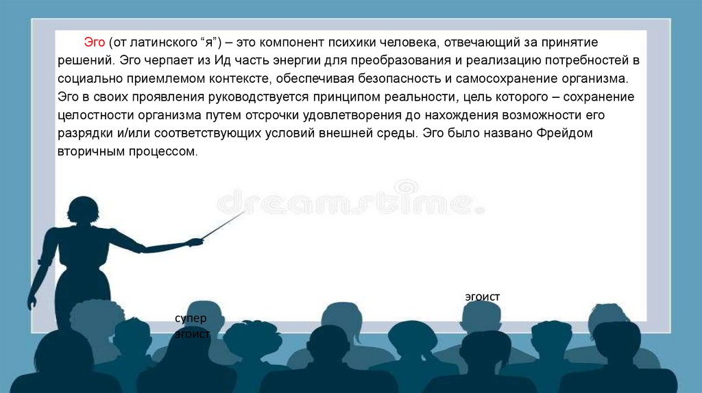 Эго (от латинского “я”) – это компонент психики человека, отвечающий за принятиерешений. Эго черпает из Ид часть энергии для преобразования и реализацию потребностей в