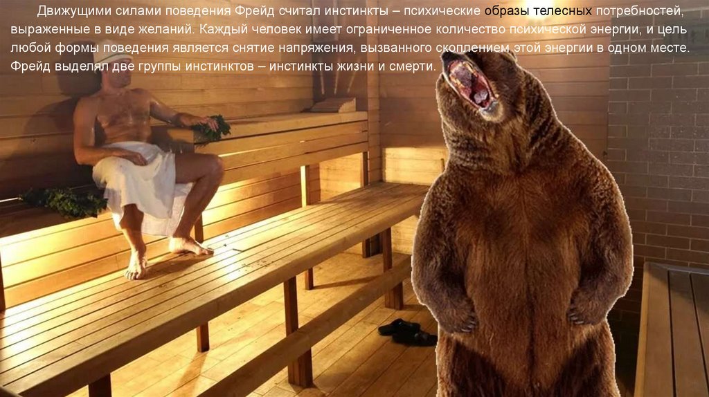 Движущими силами поведения Фрейд считал инстинкты – психические образы телесных потребностей,выраженные в виде желаний. Каждый человек имеет ограниченное количество психической энергии, и цель