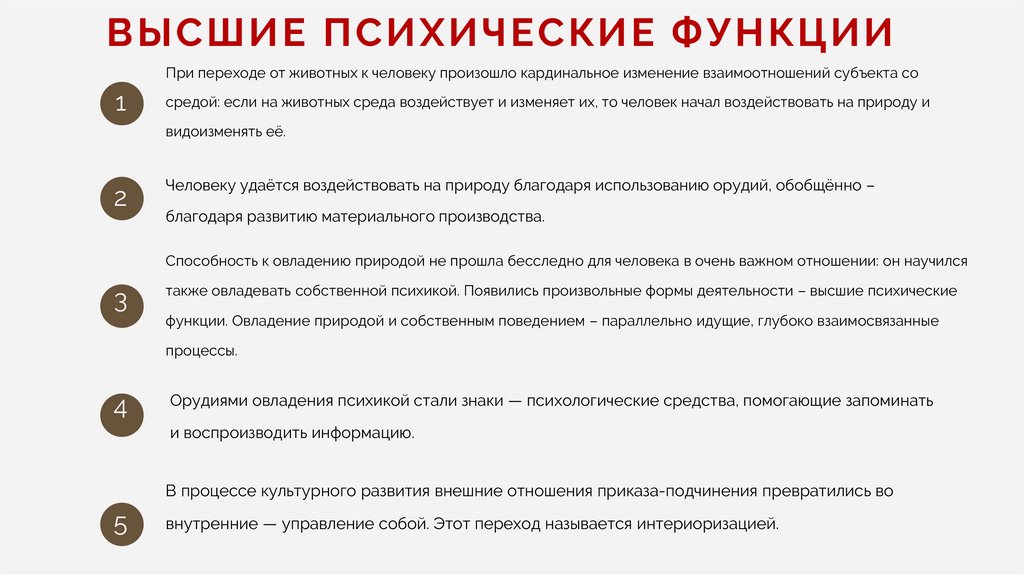 ВЫСШИЕ ПСИХИЧЕСКИЕ ФУНКЦИИПри переходе от животных к человеку произошло кардинальное изменение взаимоотношений субъекта со