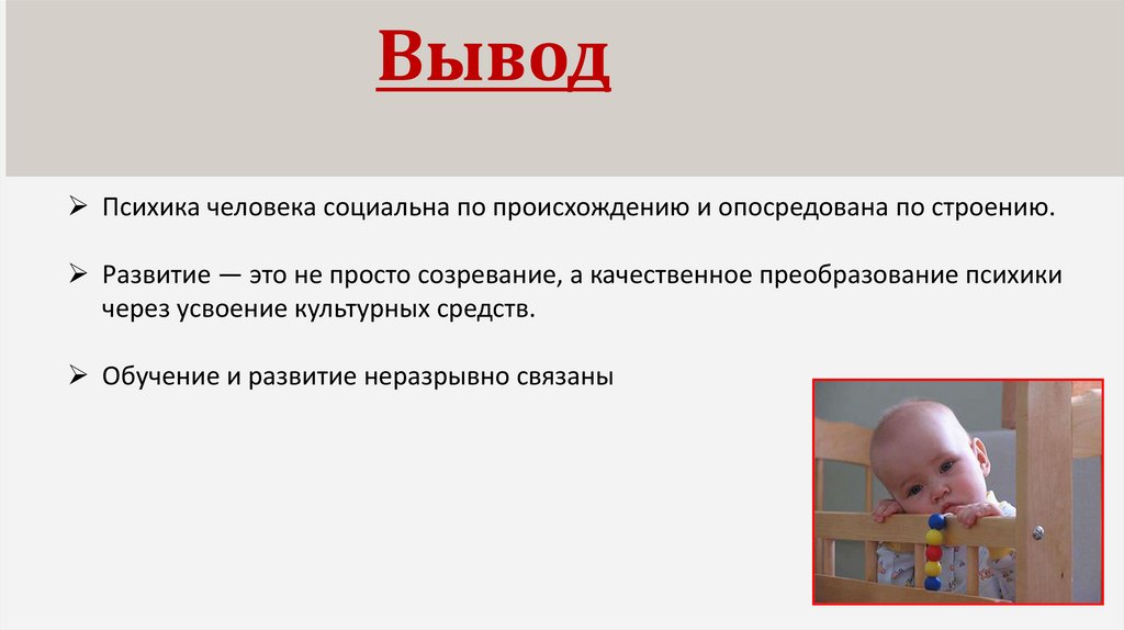 ВыводПсихика человека социальна по происхождению и опосредована по строению.