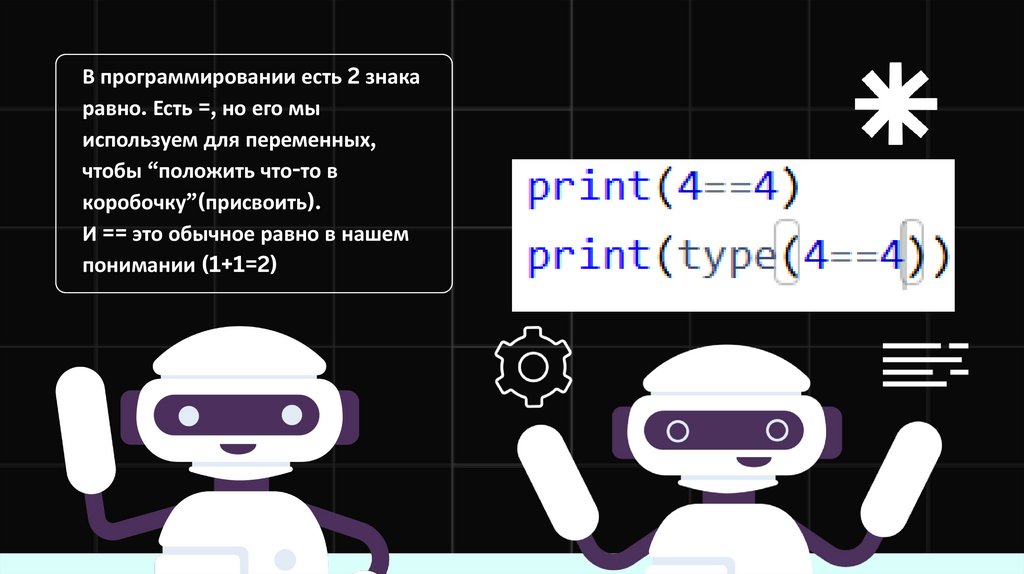 В программировании есть 2 знакаравно. Есть =, но его мы