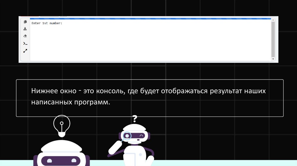 Нижнее окно - это консоль, где будет отображаться результат нашихнаписанных программ.