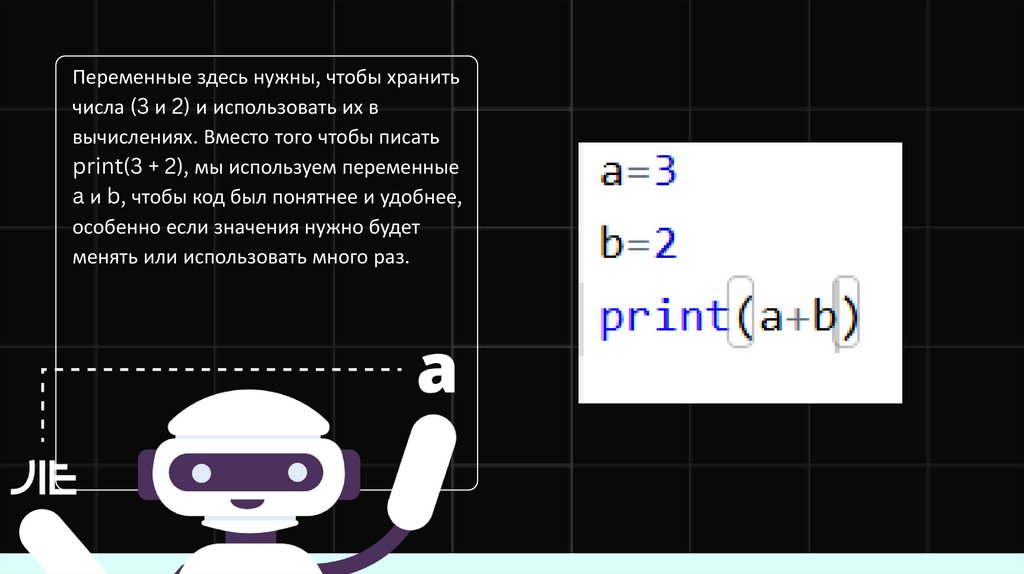 Переменные здесь нужны, чтобы хранитьчисла (3 и 2) и использовать их в