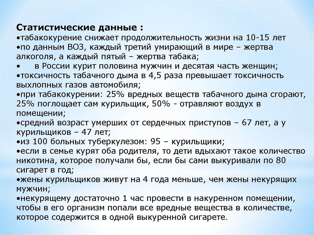 Статистические данные :•табакокурение снижает продолжительность жизни на 10-15 лет