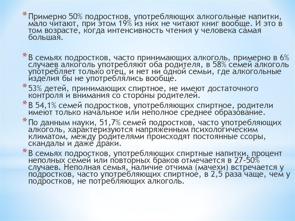* В 54,1% семей подростков, употребляющих спиртное, родители