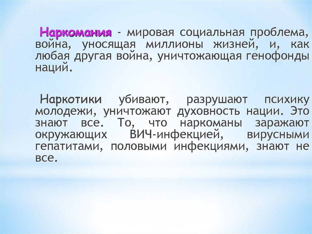 Наркомания - мировая социальная проблема,война, уносящая миллионы жизней, и, как