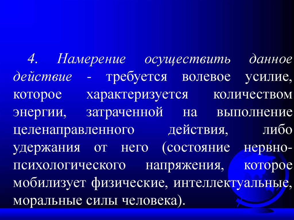 4. Намерение осуществить данноедействие - требуется волевое усилие,
