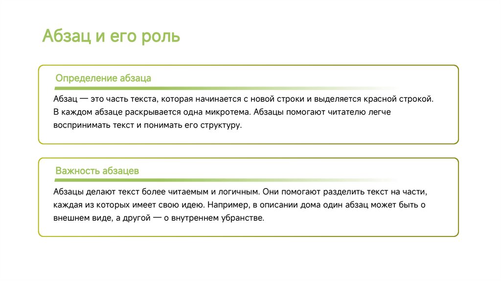 В каждом абзаце раскрывается одна микротема. Абзацы помогают читателю легче