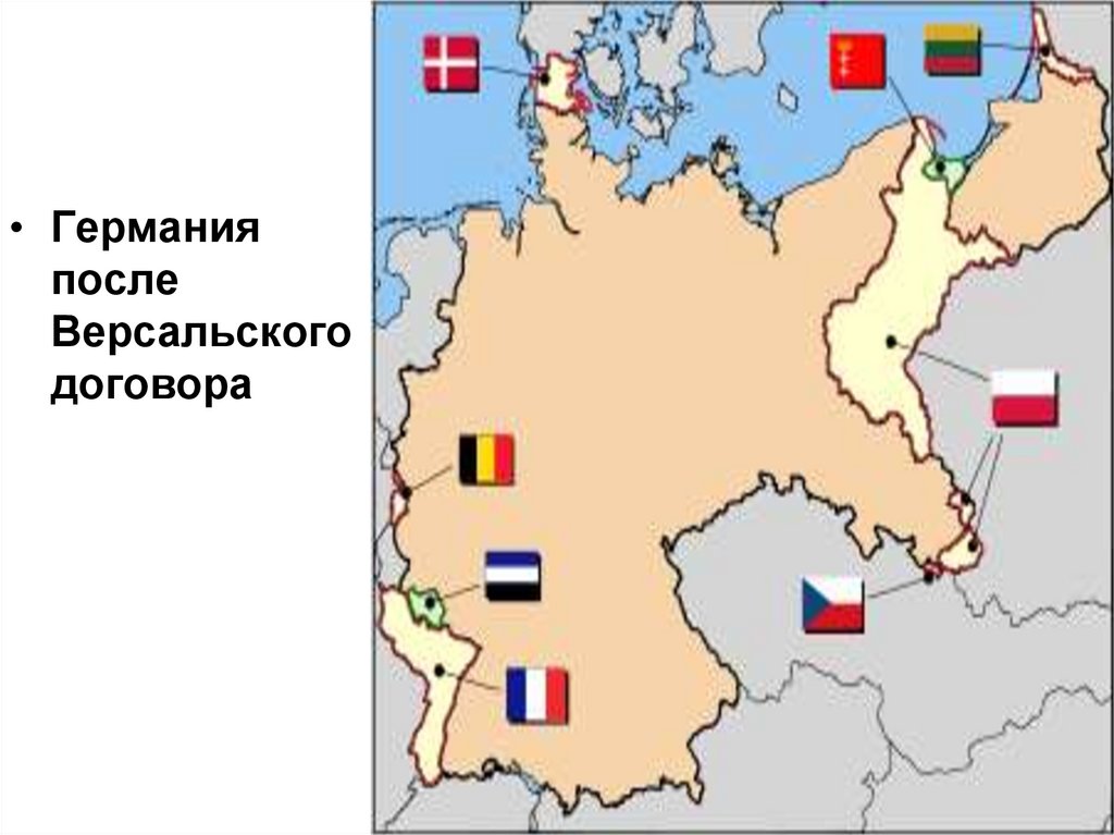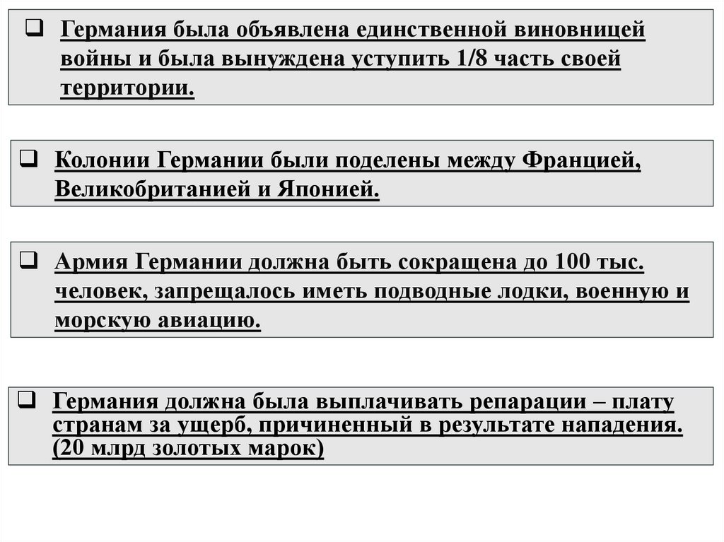 Германия была объявлена единственной виновницейвойны и была вынуждена уступить 1/8 часть своей