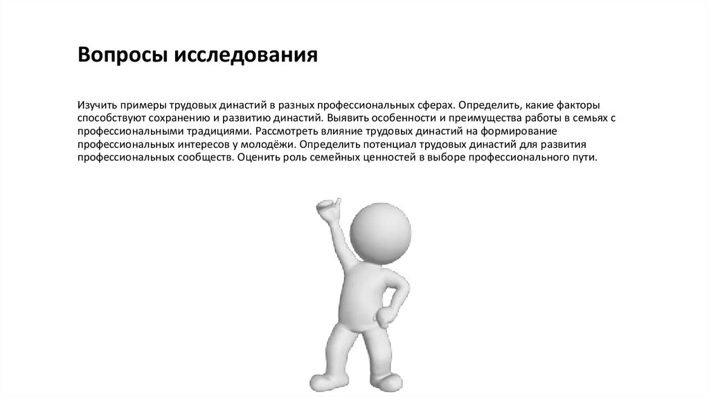 Вопросы исследованияИзучить примеры трудовых династий в разных профессиональных сферах. Определить, какие факторы