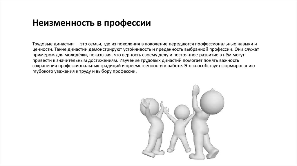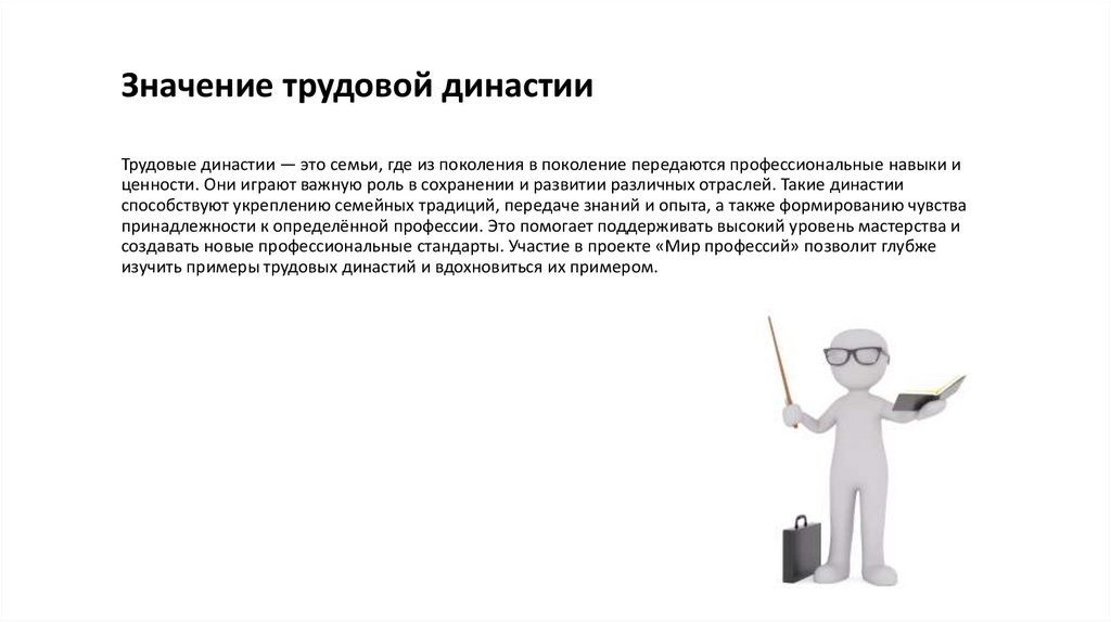 Значение трудовой династииТрудовые династии — это семьи, где из поколения в поколение передаются профессиональные навыки и