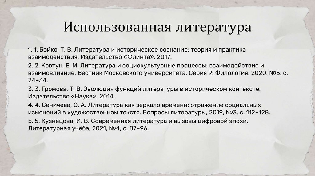 Использованная литература1. 1. Бойко, Т. В. Литература и историческое сознание: теория и практика