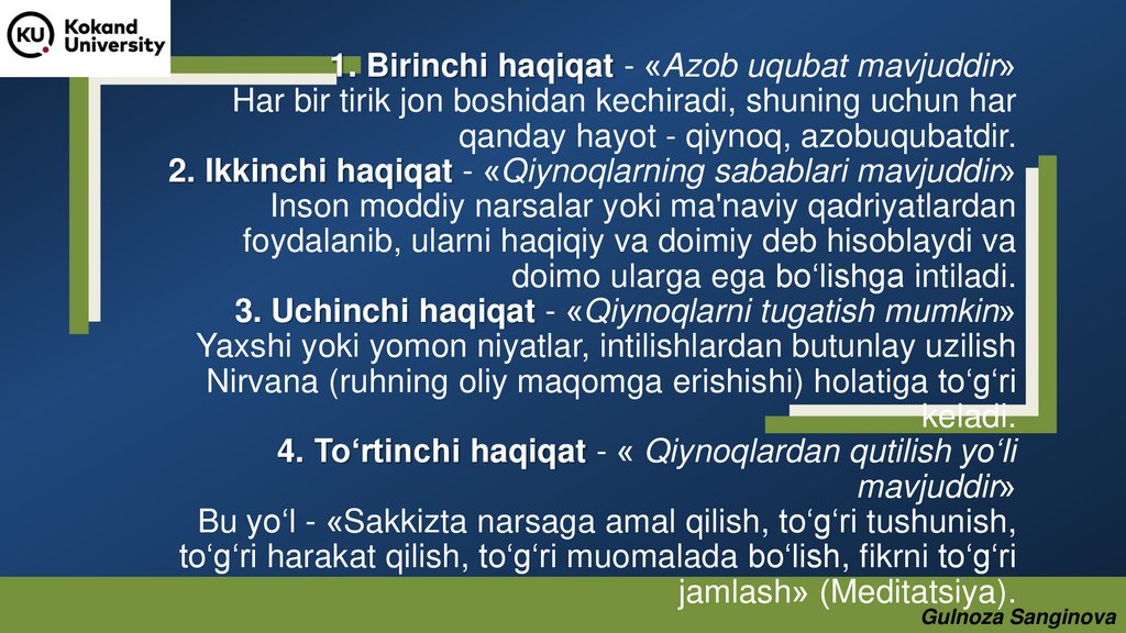 1. Birinchi haqiqat - «Azob uqubat mavjuddir»Har bir tirik jon boshidan kechiradi, shuning uchun har