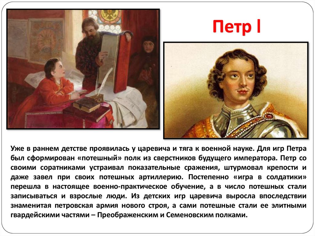 Петр IУже в раннем детстве проявилась у царевича и тяга к военной науке. Для игр Петра