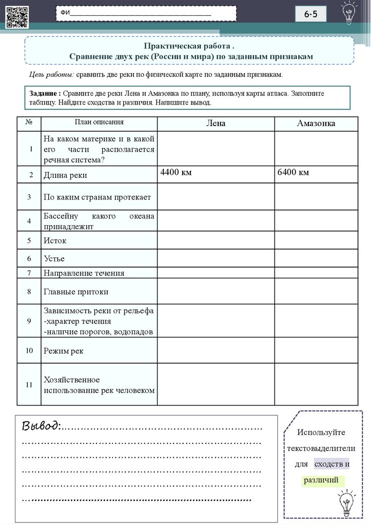 Задание : Сравните две реки Лена и Амазонка по плану, используя карты атласа. Заполните