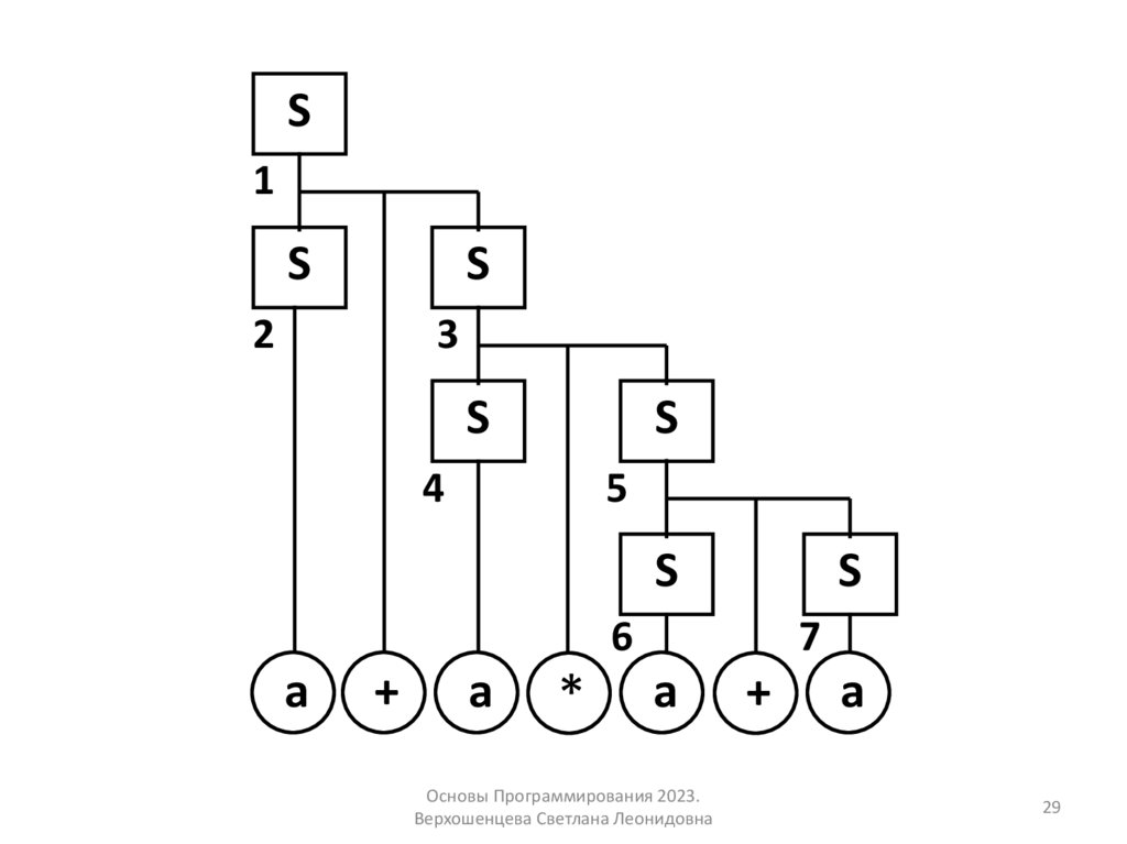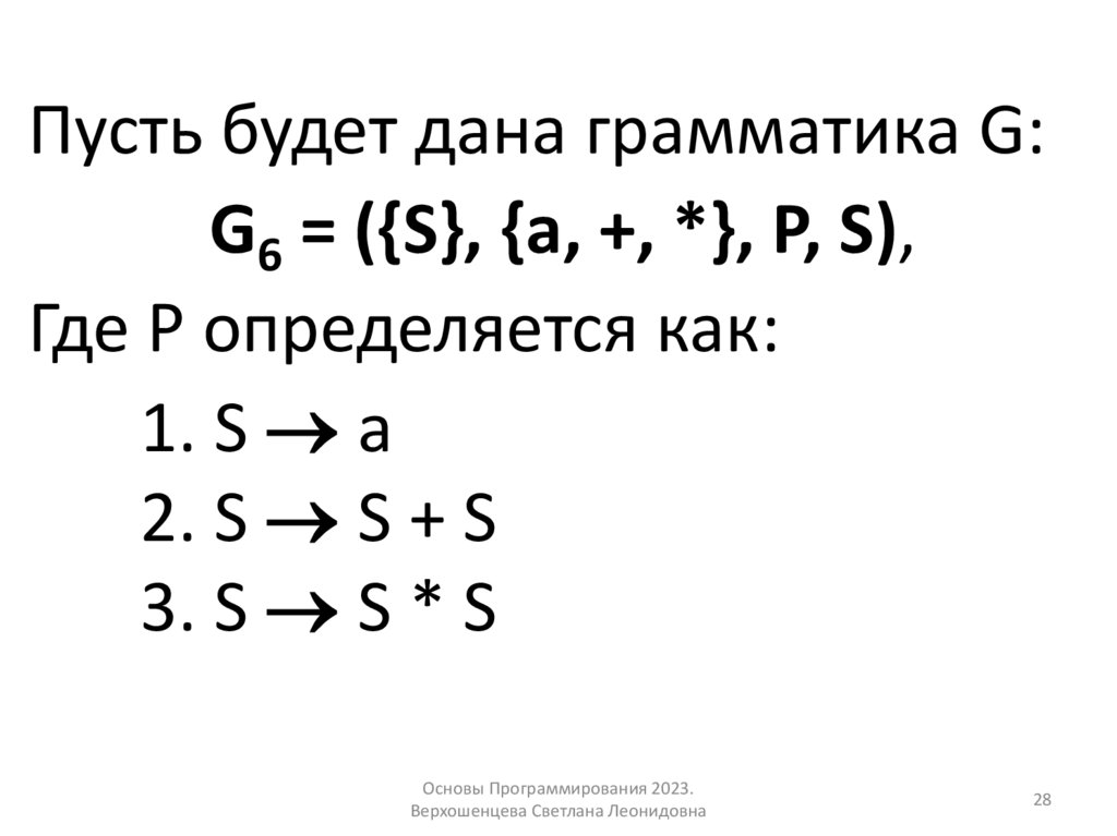 Пусть будет дана грамматика G:G6 = ({S}, {a, +, *}, P, S),
