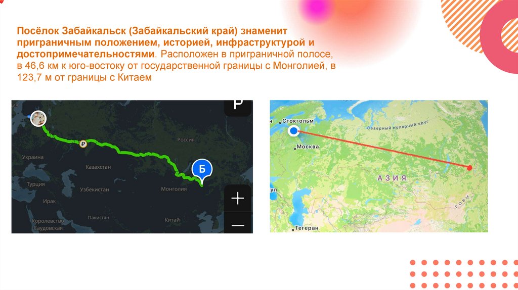 в 123,7 м от государственной границы с Китаем. Расстояние до Читы составляет 486 км.