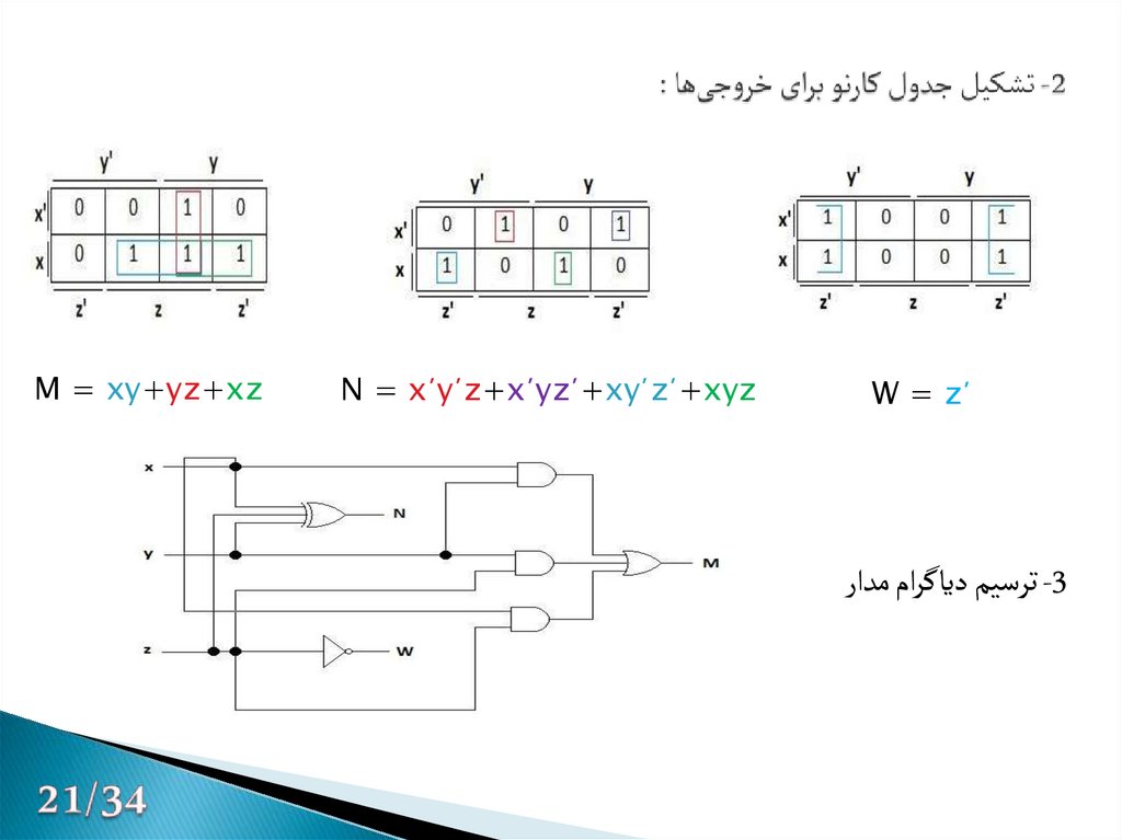 21. مثال: تابع سه متغیرهای طراحی کنید به طوریکه اگر ورودی 0،1،2،3 باشد، خروجی یک واحد افزایش و اگر ورودی 4،5،6،7 باشد، خروجی یک