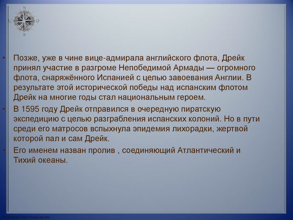 • Позже, уже в чине вице-адмирала английского флота, Дрейкпринял участие в разгроме Непобедимой Армады — огромного