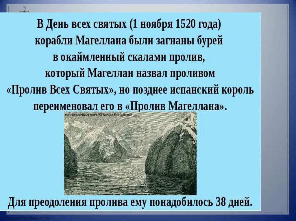 Обогнув южную оконечность Америки,он обнаружил пролив, названный позже