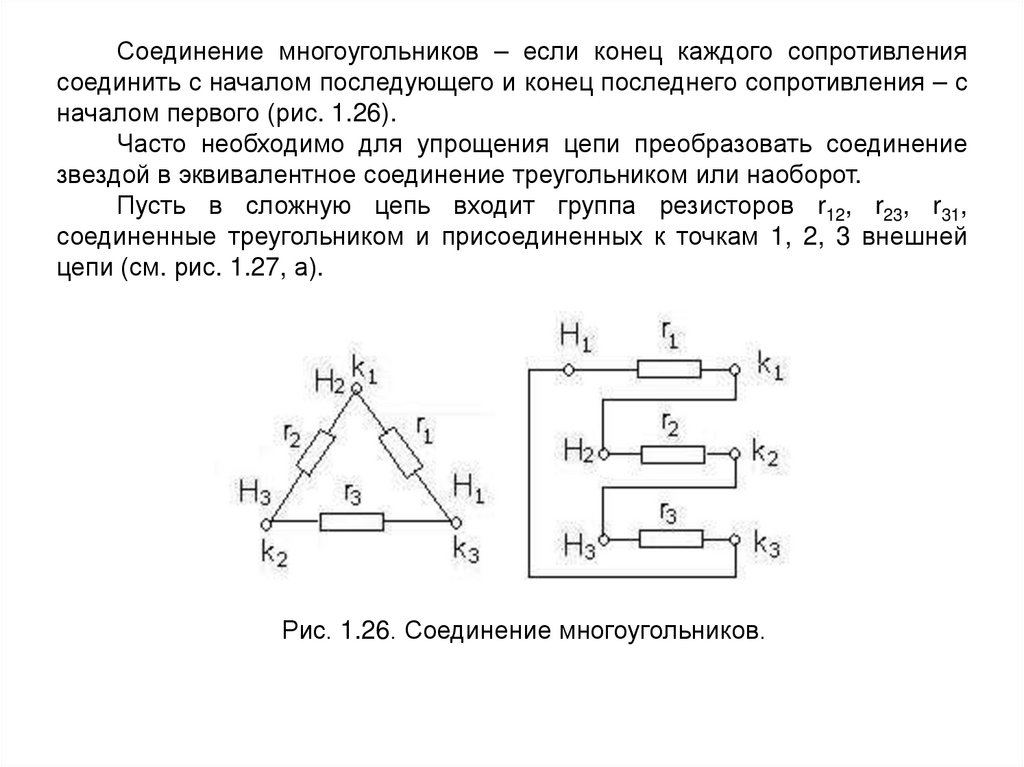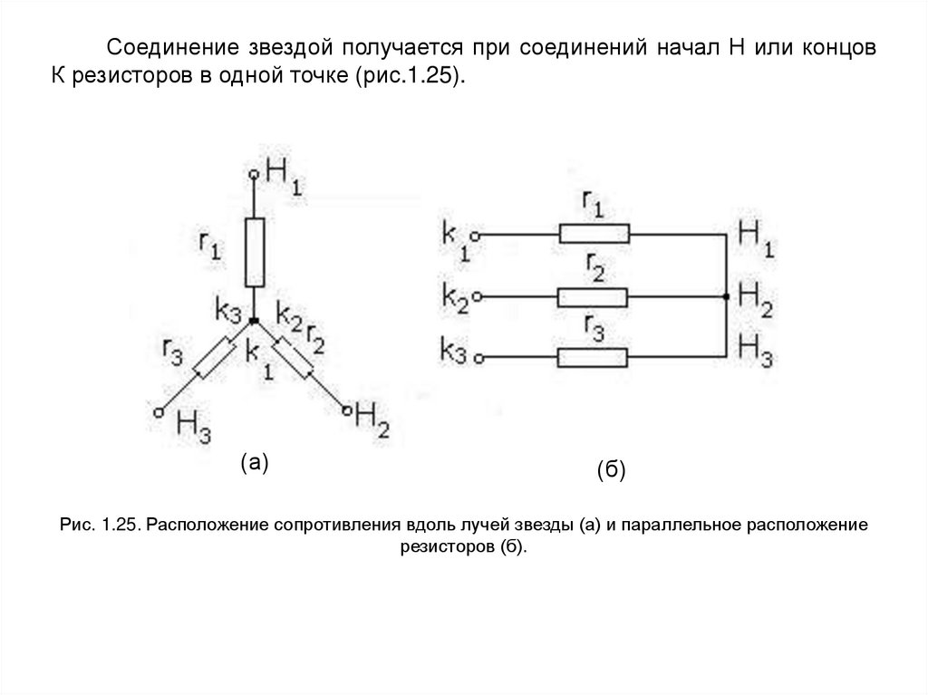 Соединение звездой получается при соединений начал Н или концовК резисторов в одной точке (рис.1.25).