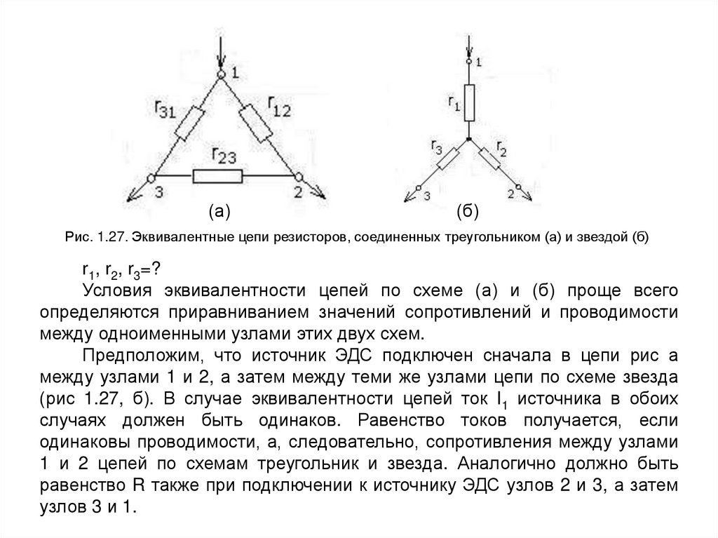 Рис. 1.27. Эквивалентные цепи резисторов, соединенных треугольником (а) и звездой (б)