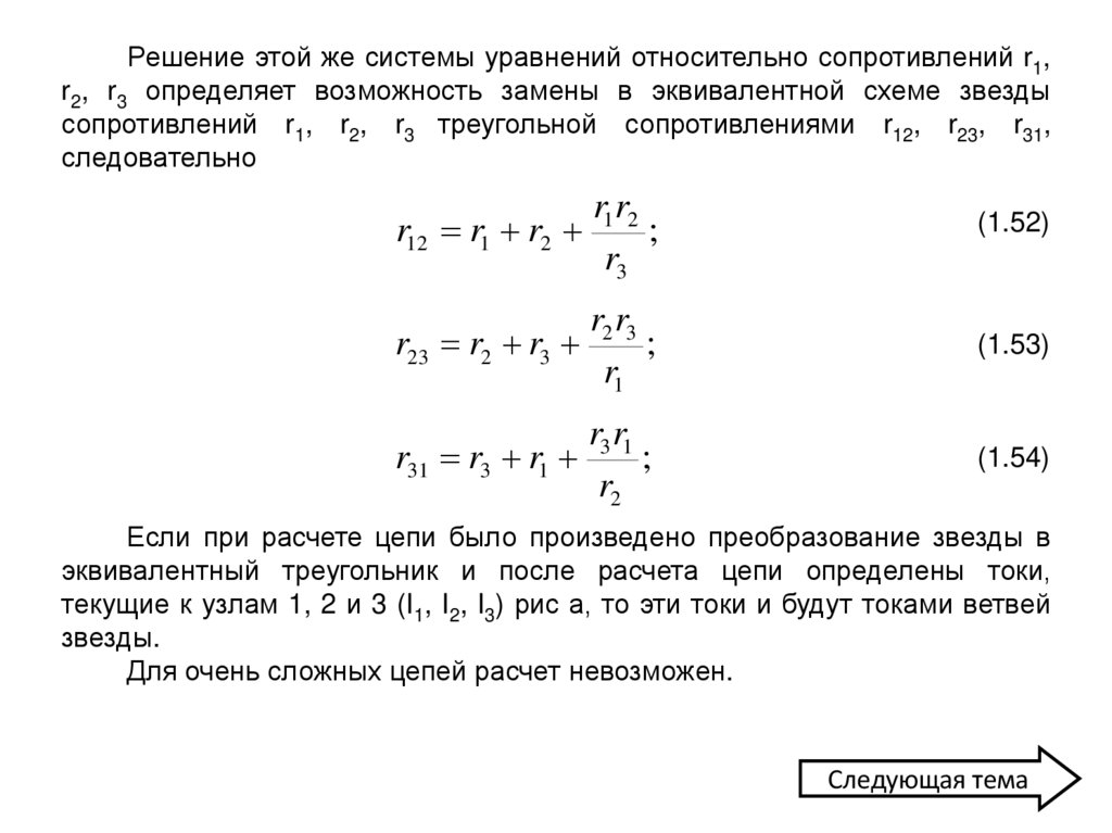Решение этой же системы уравнений относительно сопротивлений r1,r2, r3 определяет возможность замены в эквивалентной схеме звезды