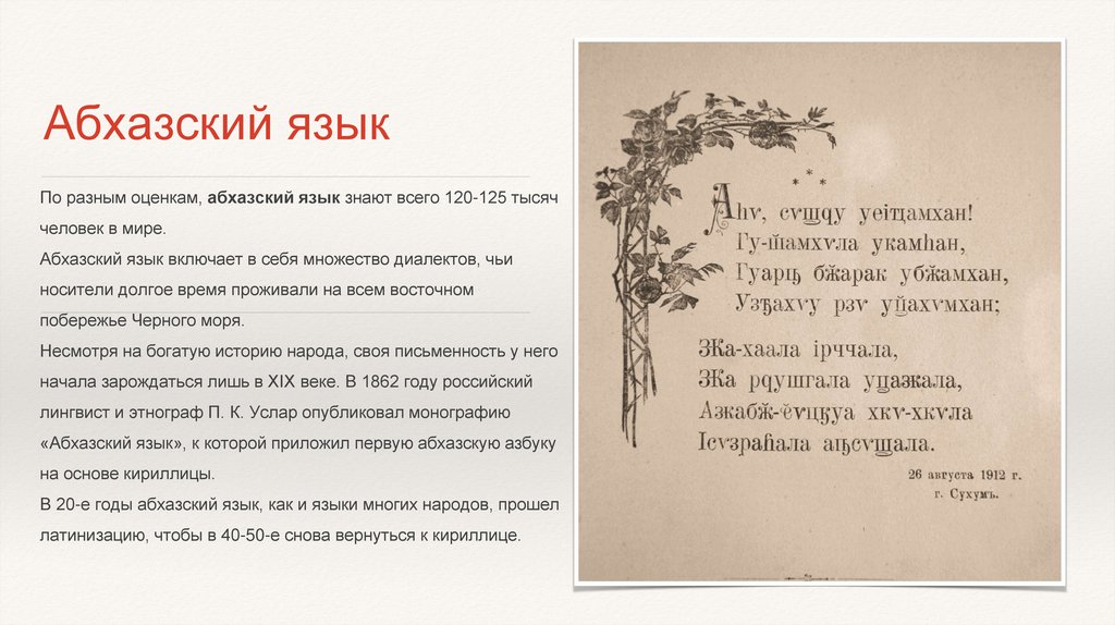 Абхазский языкПо разным оценкам, абхазский язык знают всего 120-125 тысяч