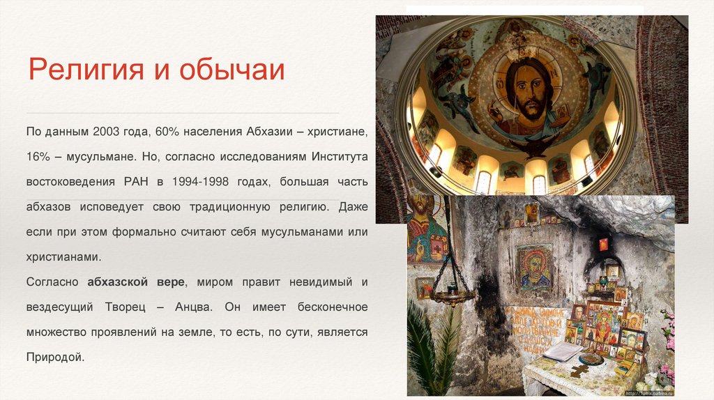Религия и обычаиПо данным 2003 года, 60% населения Абхазии – христиане,