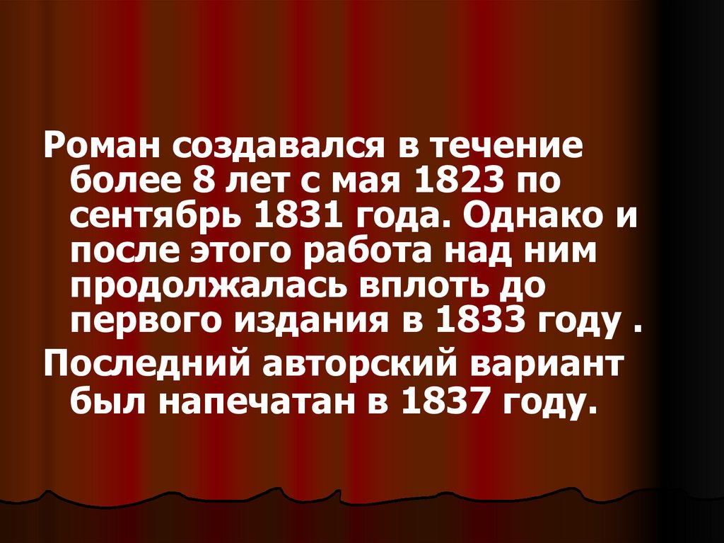 Роман создавался в течениеболее 8 лет с мая 1823 по