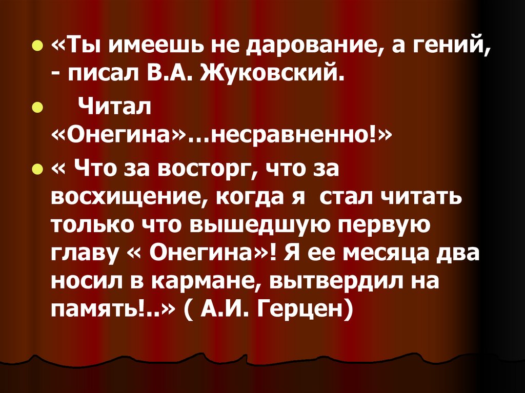 «Ты имеешь не дарование, а гений,- писал В.А. Жуковский.