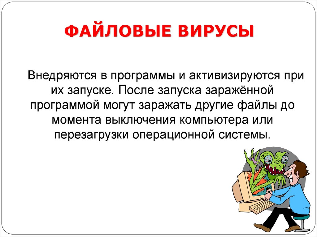 ФАЙЛОВЫЕ ВИРУСЫВнедряются в программы и активизируются при