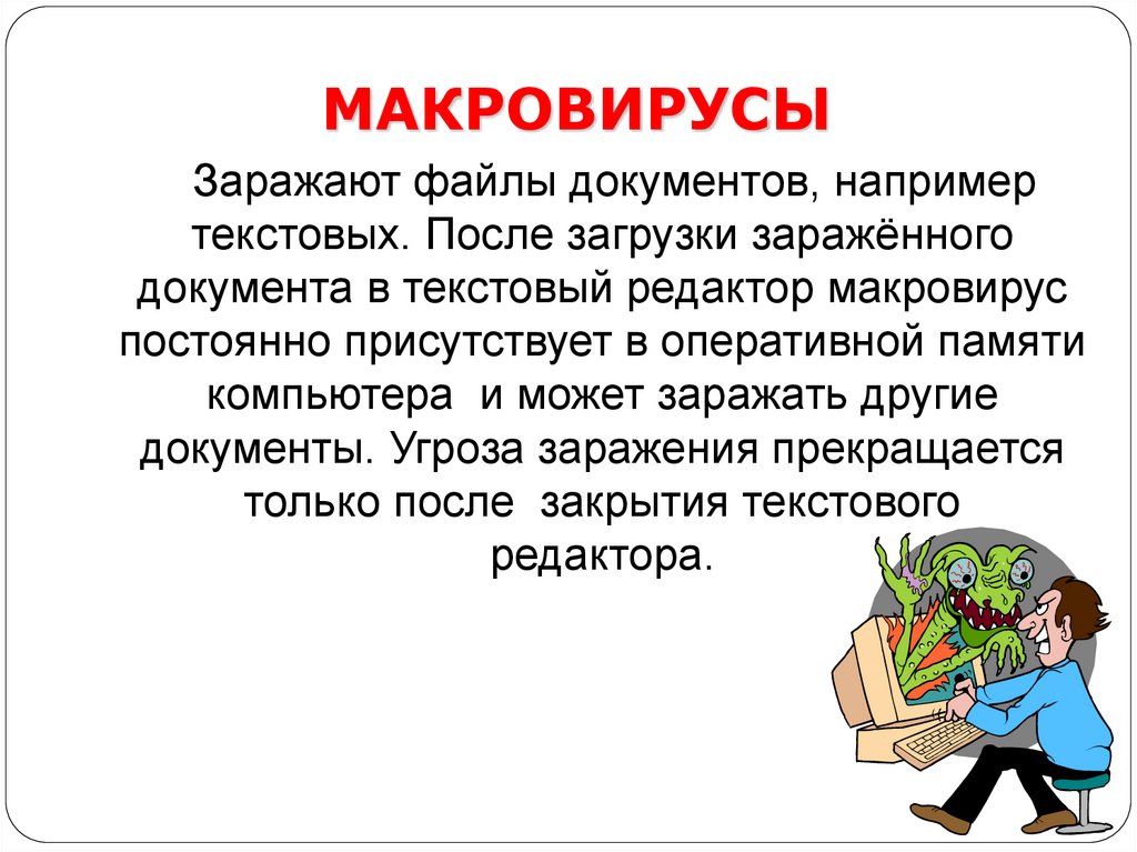 МАКРОВИРУСЫЗаражают файлы документов, например