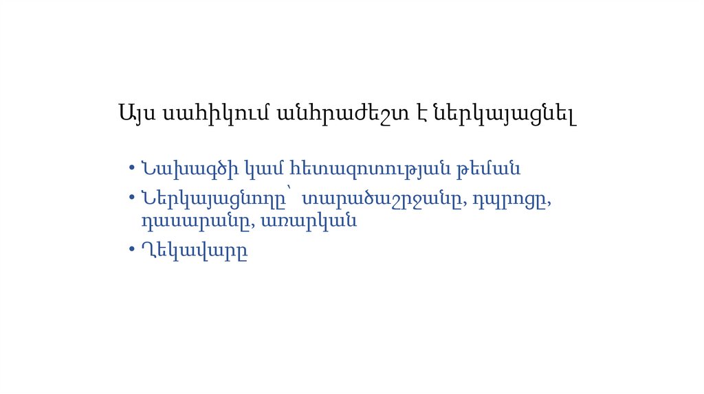 Այս սահիկում անհրաժեշտ է ներկայացնել• Նախագծի կամ հետազոտության թեման