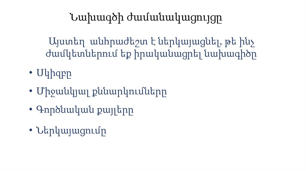 Նախագծի ժամանակացույցըԱյստեղ անհրաժեշտ է ներկայացնել, թե ինչ