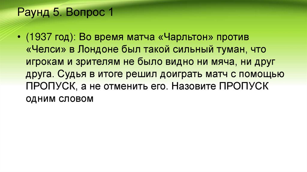 Раунд 5. Вопрос 1• (1937 год): Во время матча «Чарльтон» против