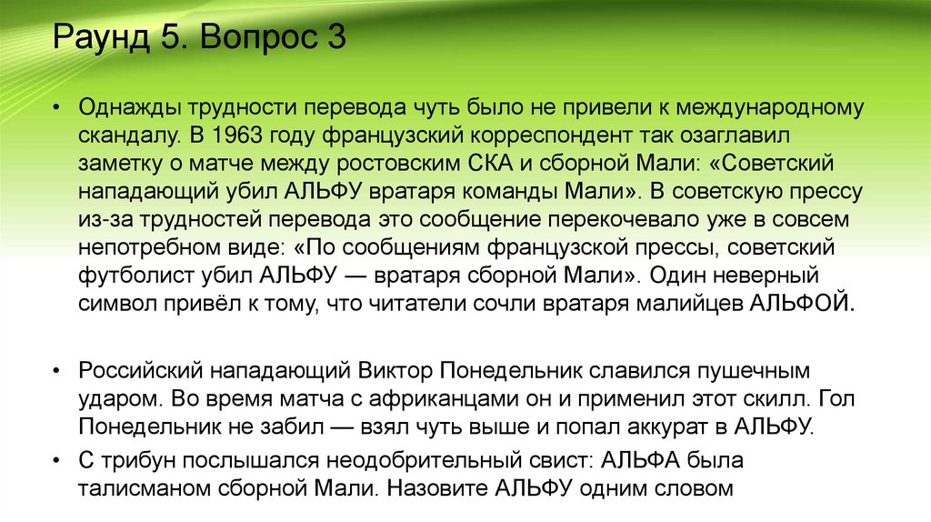 Раунд 5. Вопрос 3• Однажды трудности перевода чуть было не привели к международному
