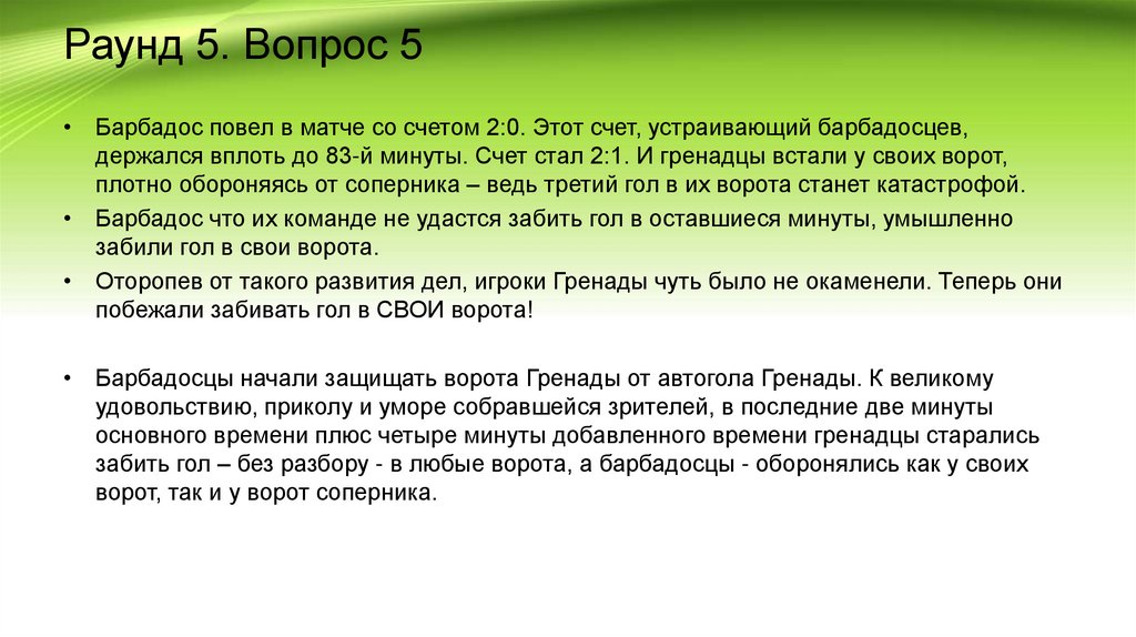 Раунд 5. Вопрос 5• Барбадос повел в матче со счетом 2:0. Этот счет, устраивающий барбадосцев,